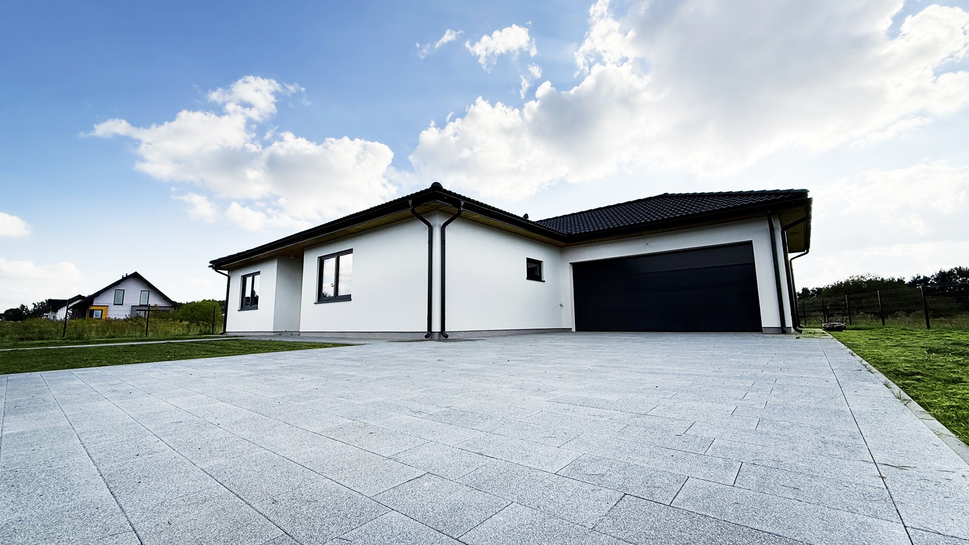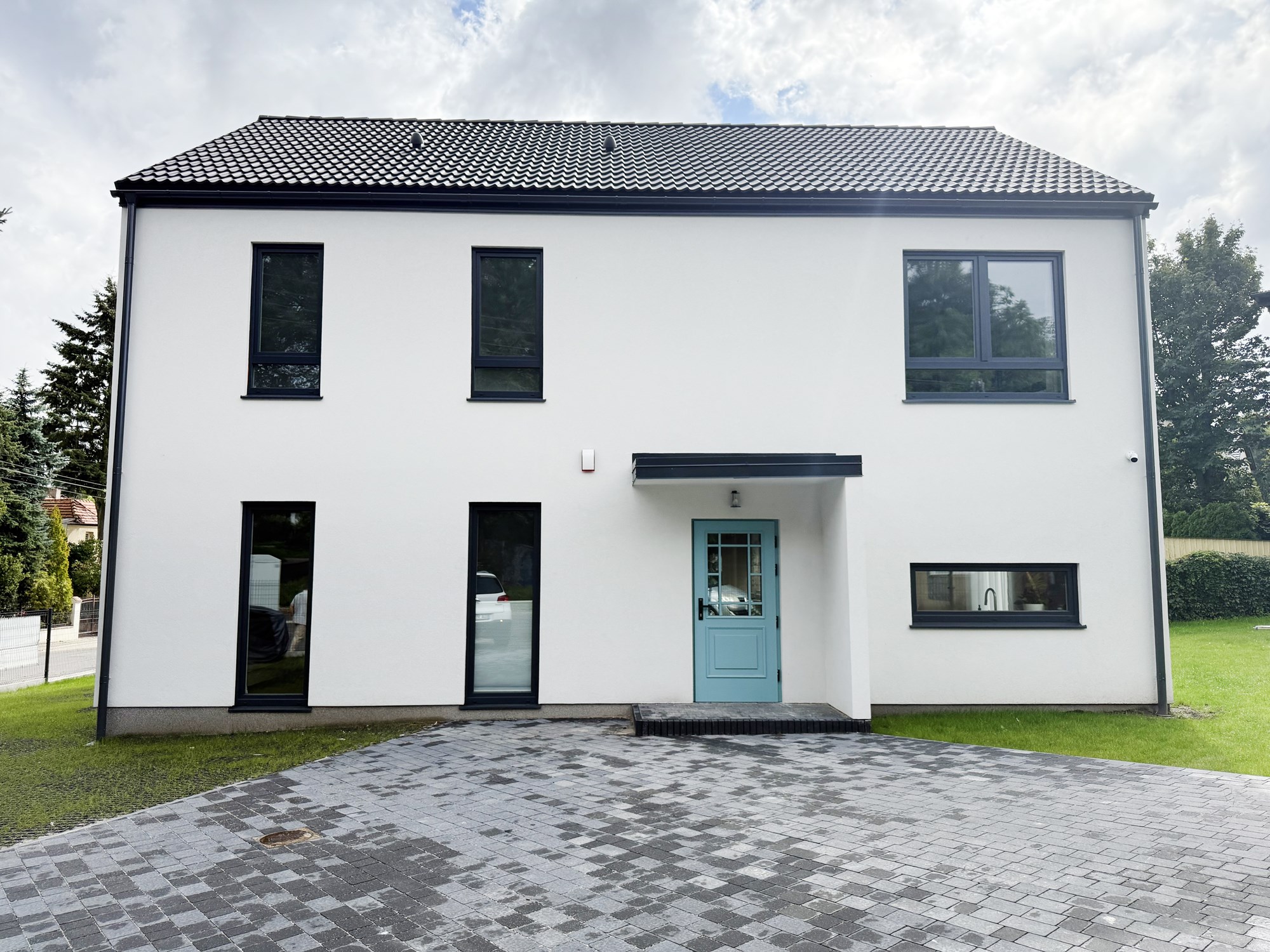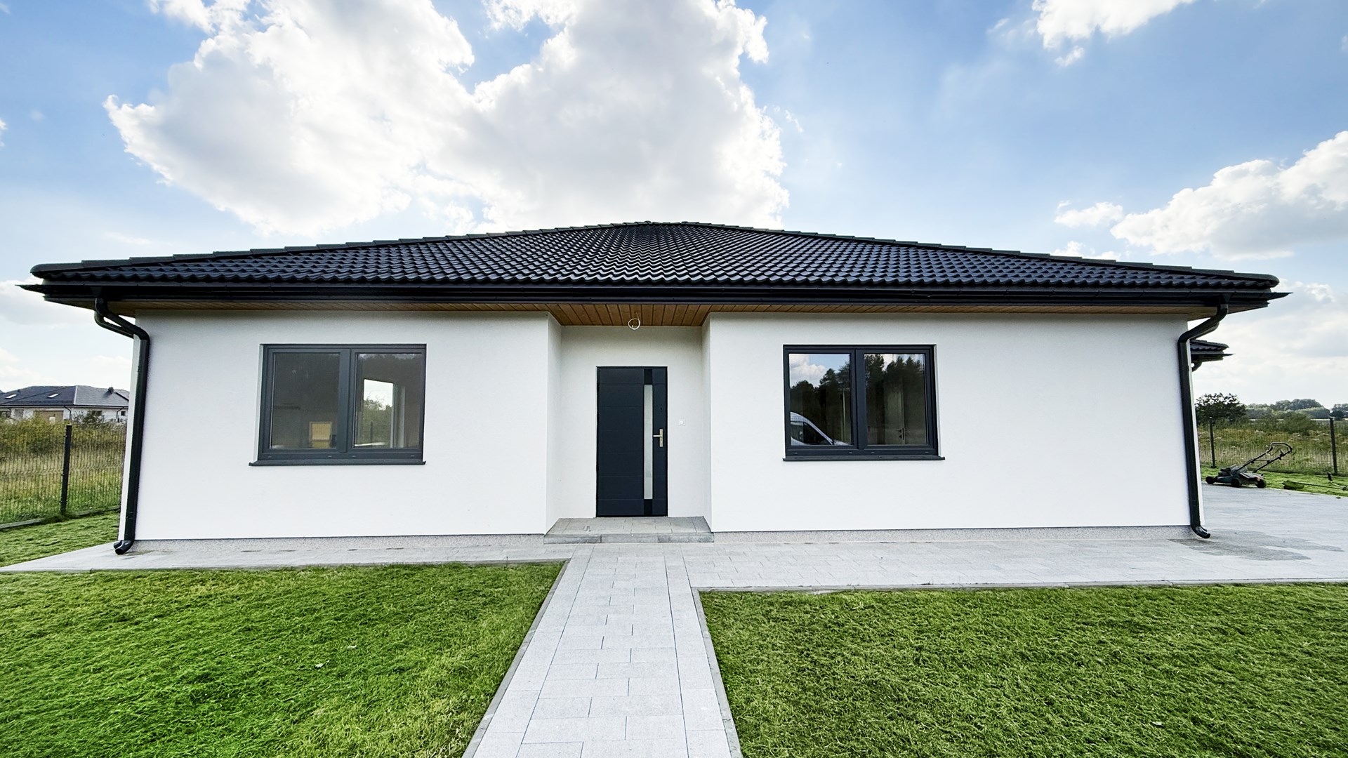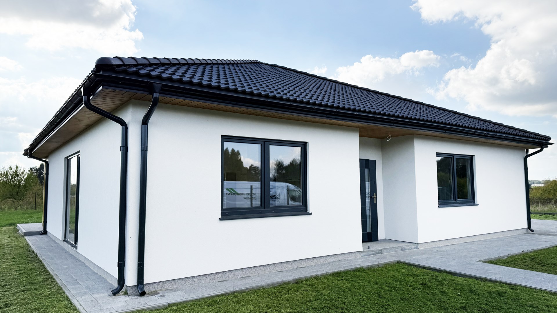 Prosta, elegancka bryła, duże przeszklenia i antracytowy dach nadają mu wyjątkowy, minimalistyczny charakter.