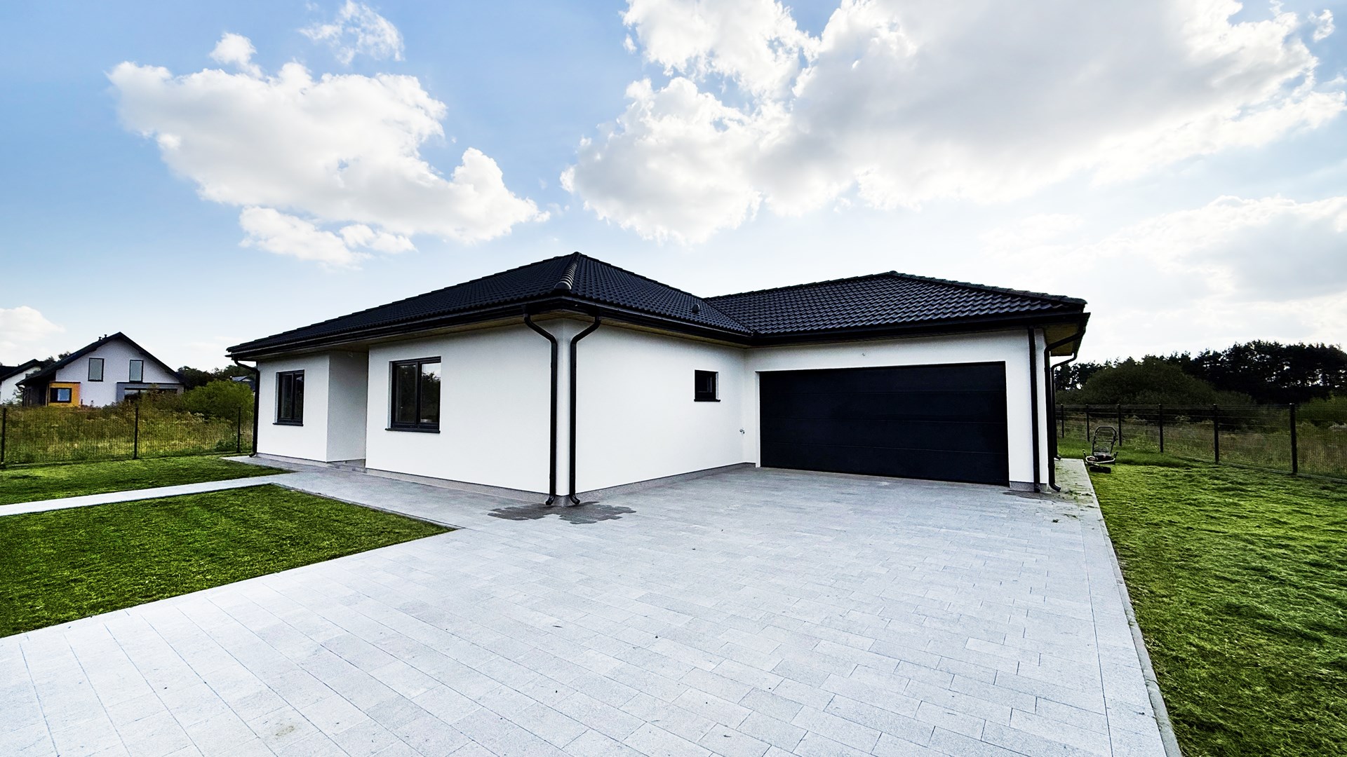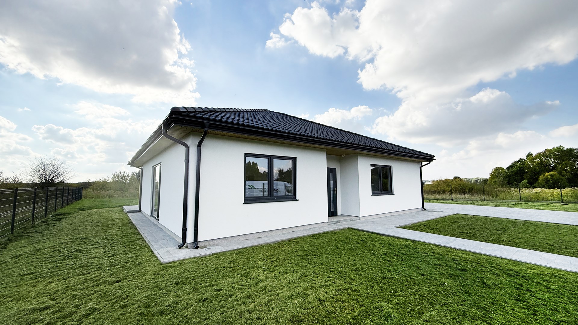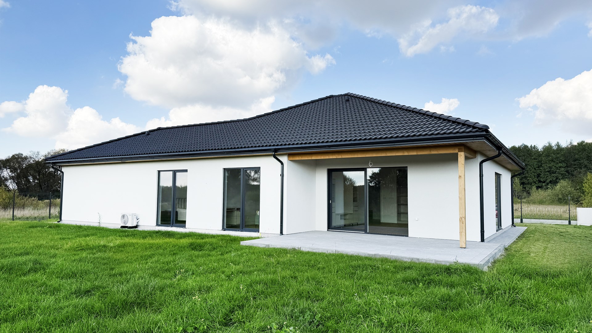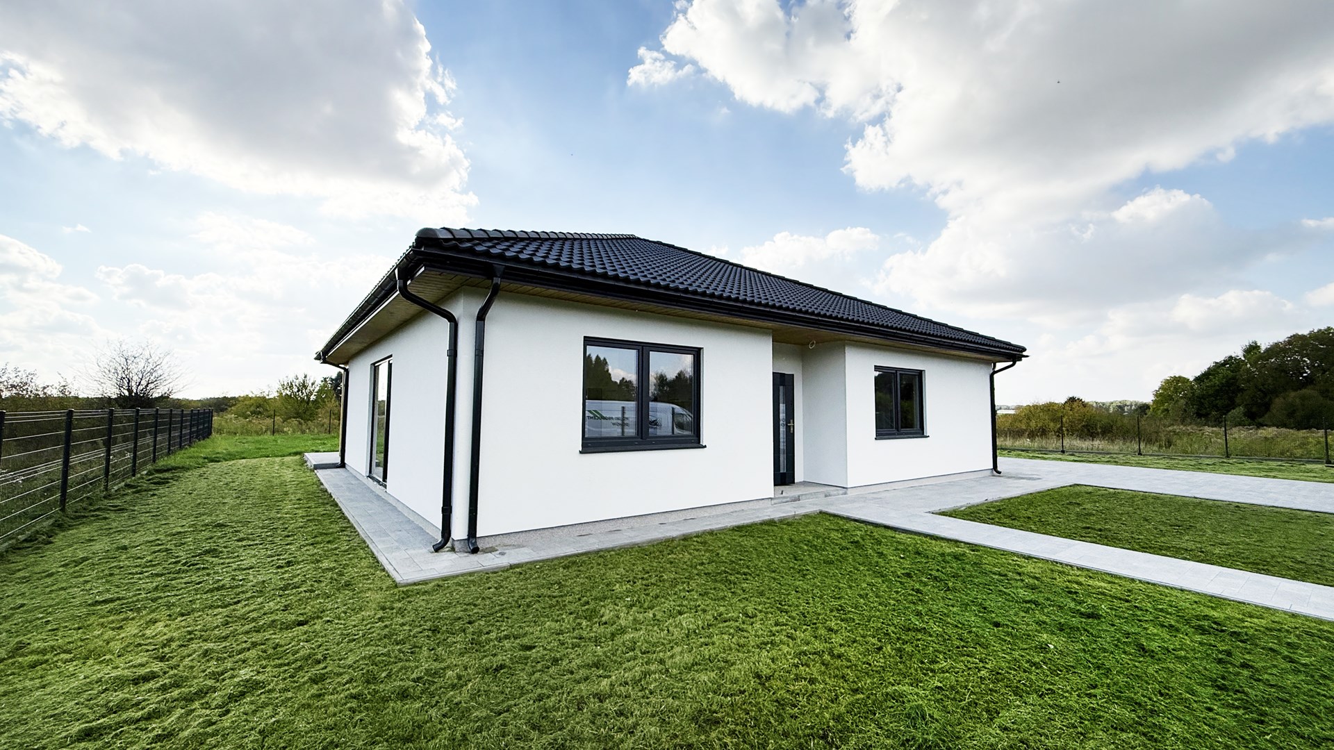 Prosta, elegancka bryła, duże przeszklenia i antracytowy dach nadają mu wyjątkowy, minimalistyczny charakter.