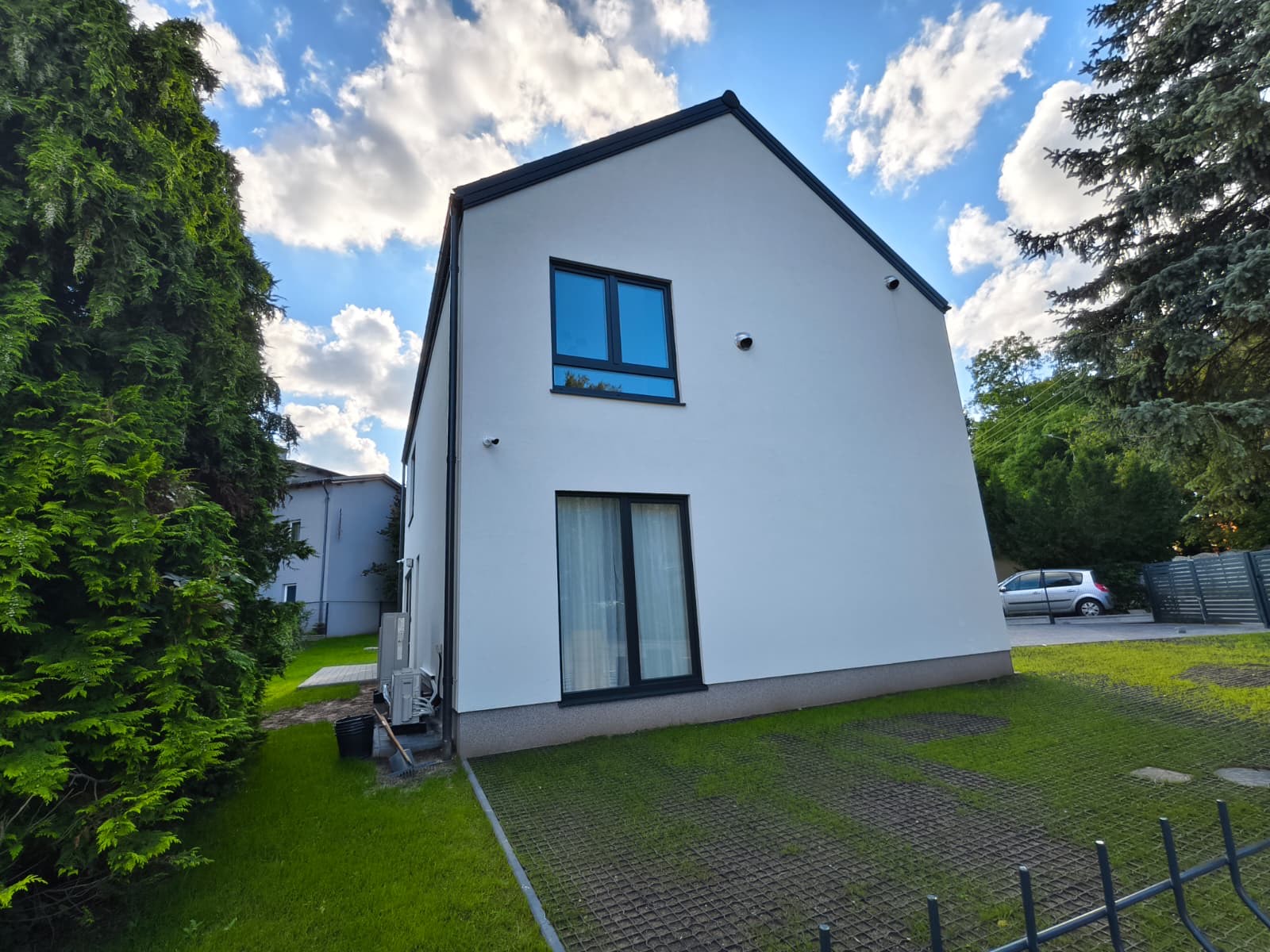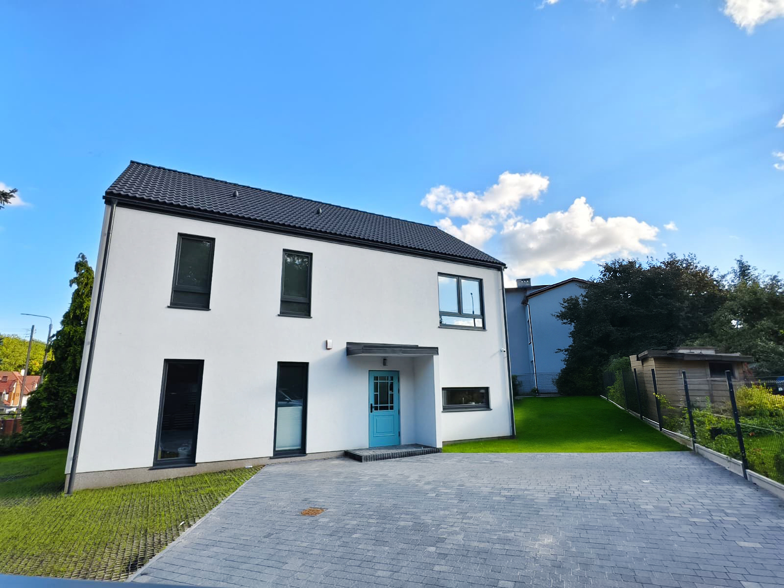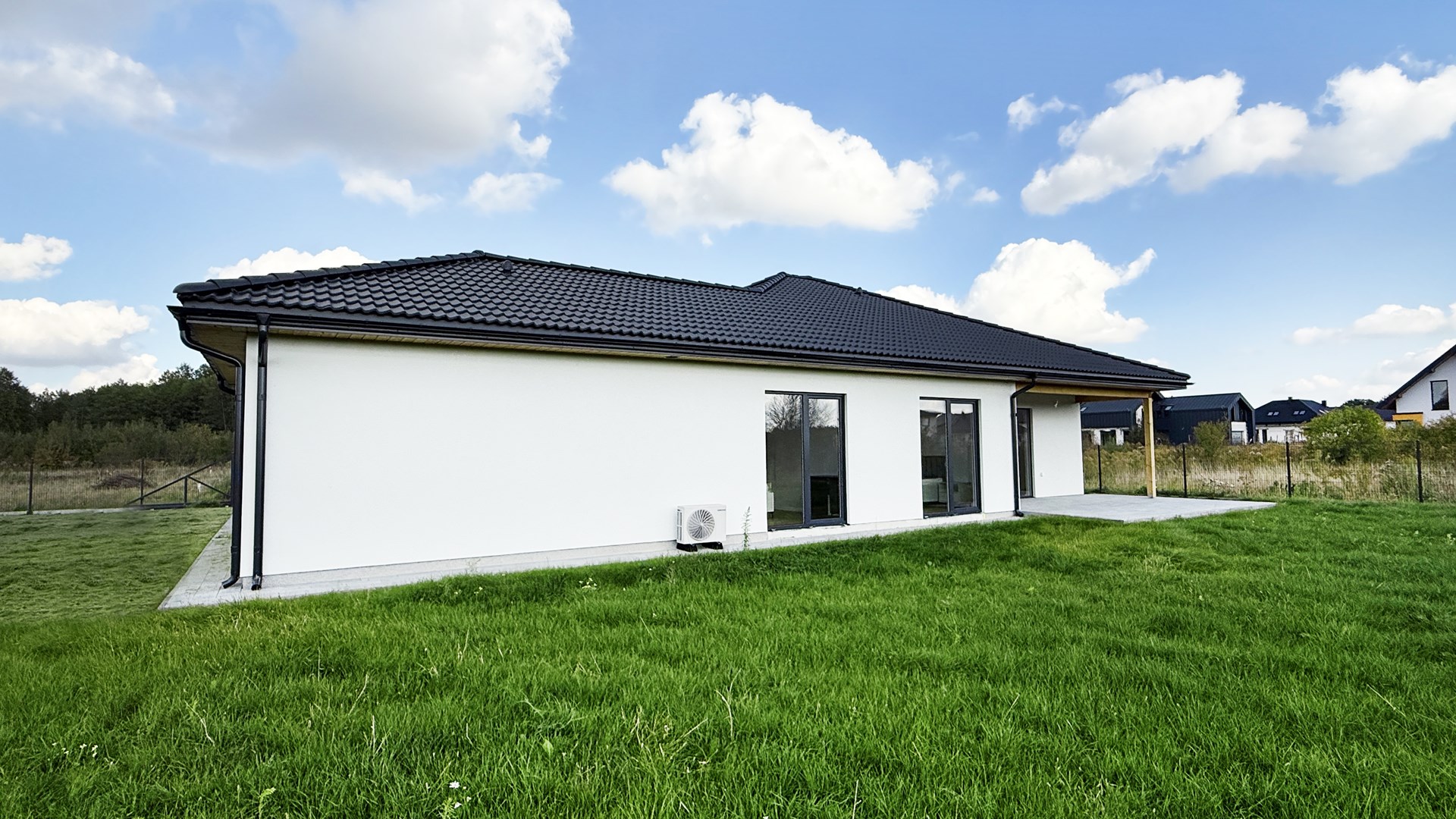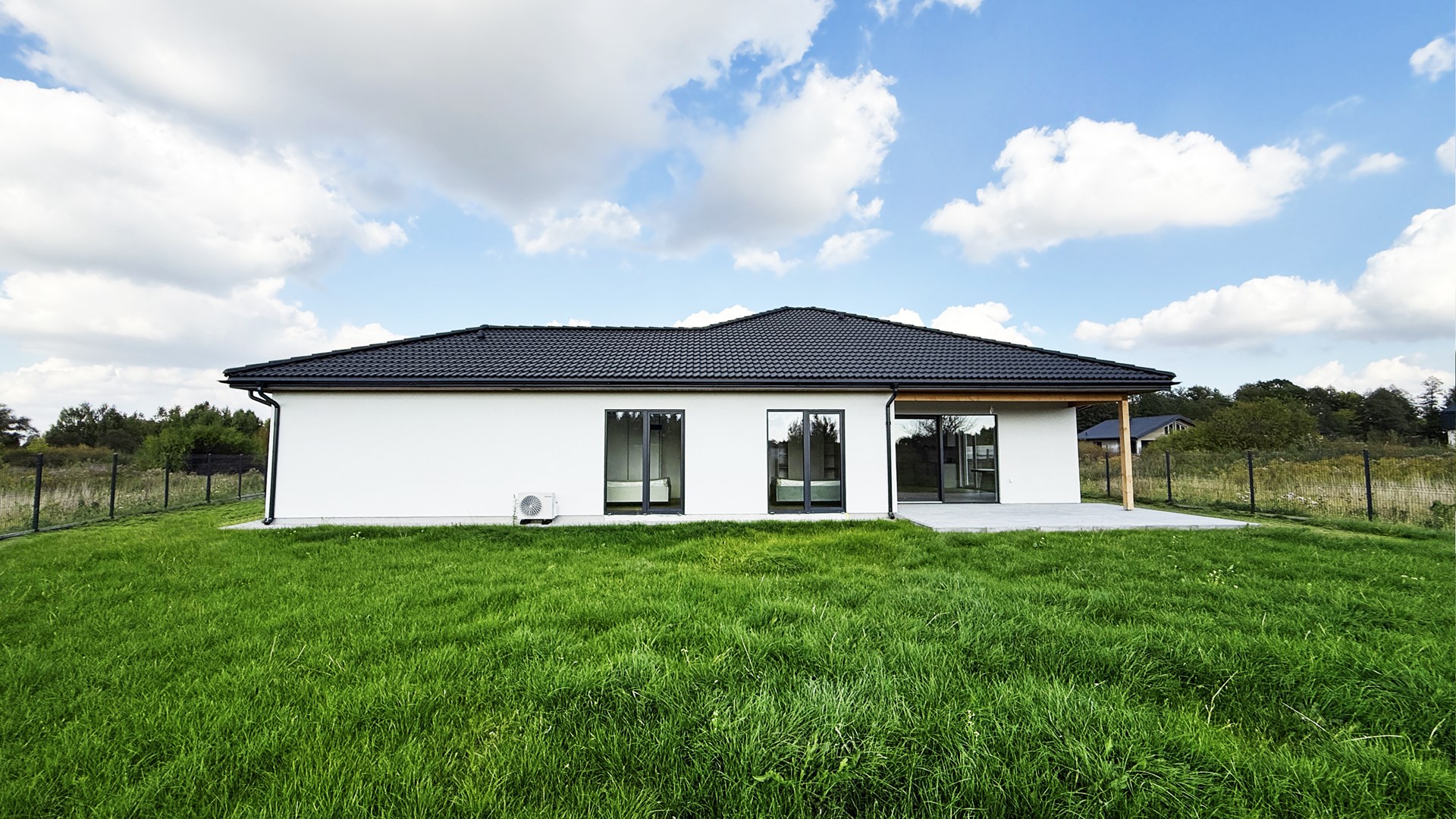 Prosta, elegancka bryła, duże przeszklenia i antracytowy dach nadają mu wyjątkowy, minimalistyczny charakter.