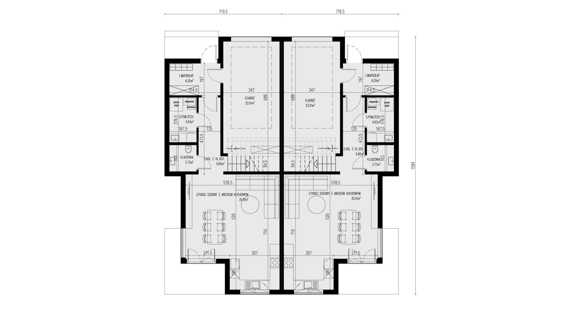 Wentylacja mechaniczna z odzyskiem ciepła w standardzie.